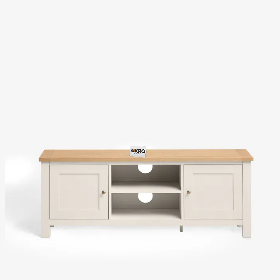Organized living: Ample open and closed storage ensures clutter-free organization of media devices, remotes, and entertainment essentials, maintaining a clean, streamlined appearance.