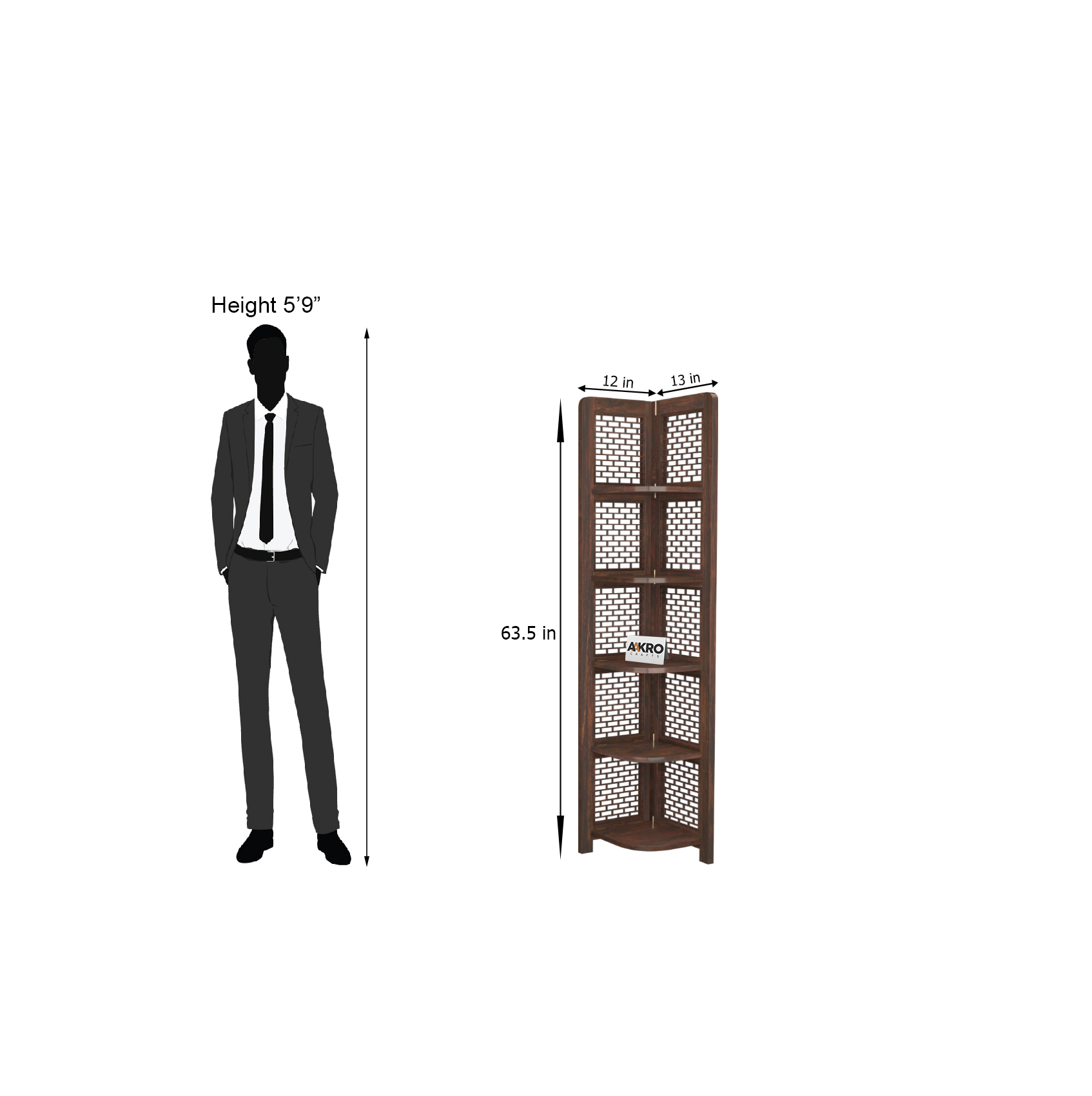Divine Sheesham Wood Brick Corner Shelf for Living Room Bedroom Home | CNC 5 Tier Corner Bookshelf | Wooden Ladder Bookcase Display Unit (Walnut Finish)