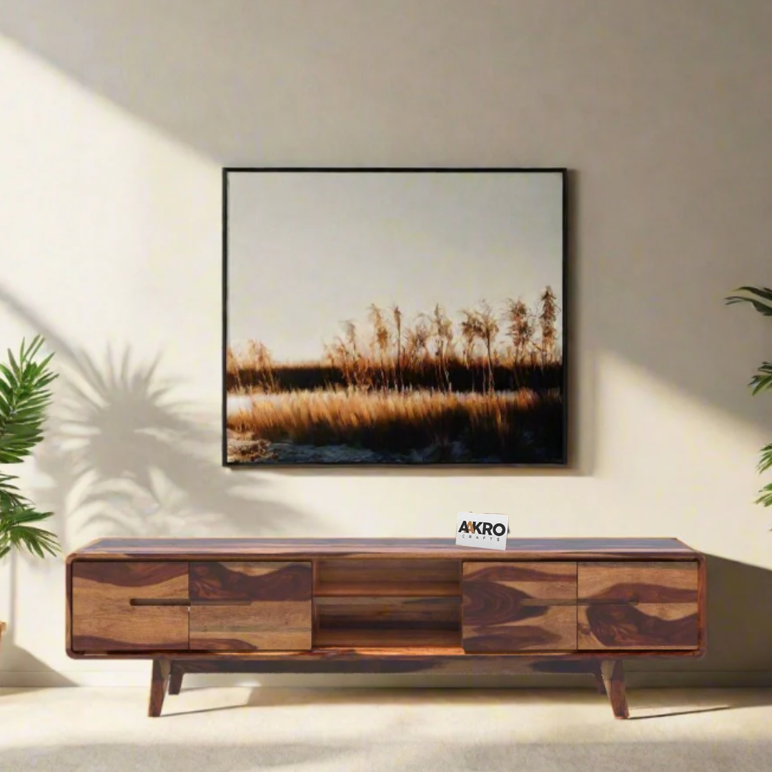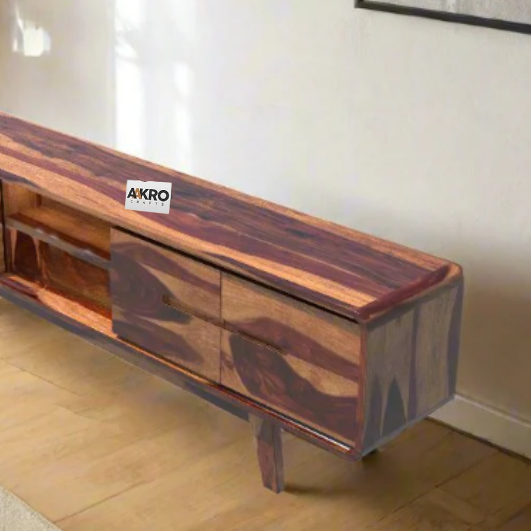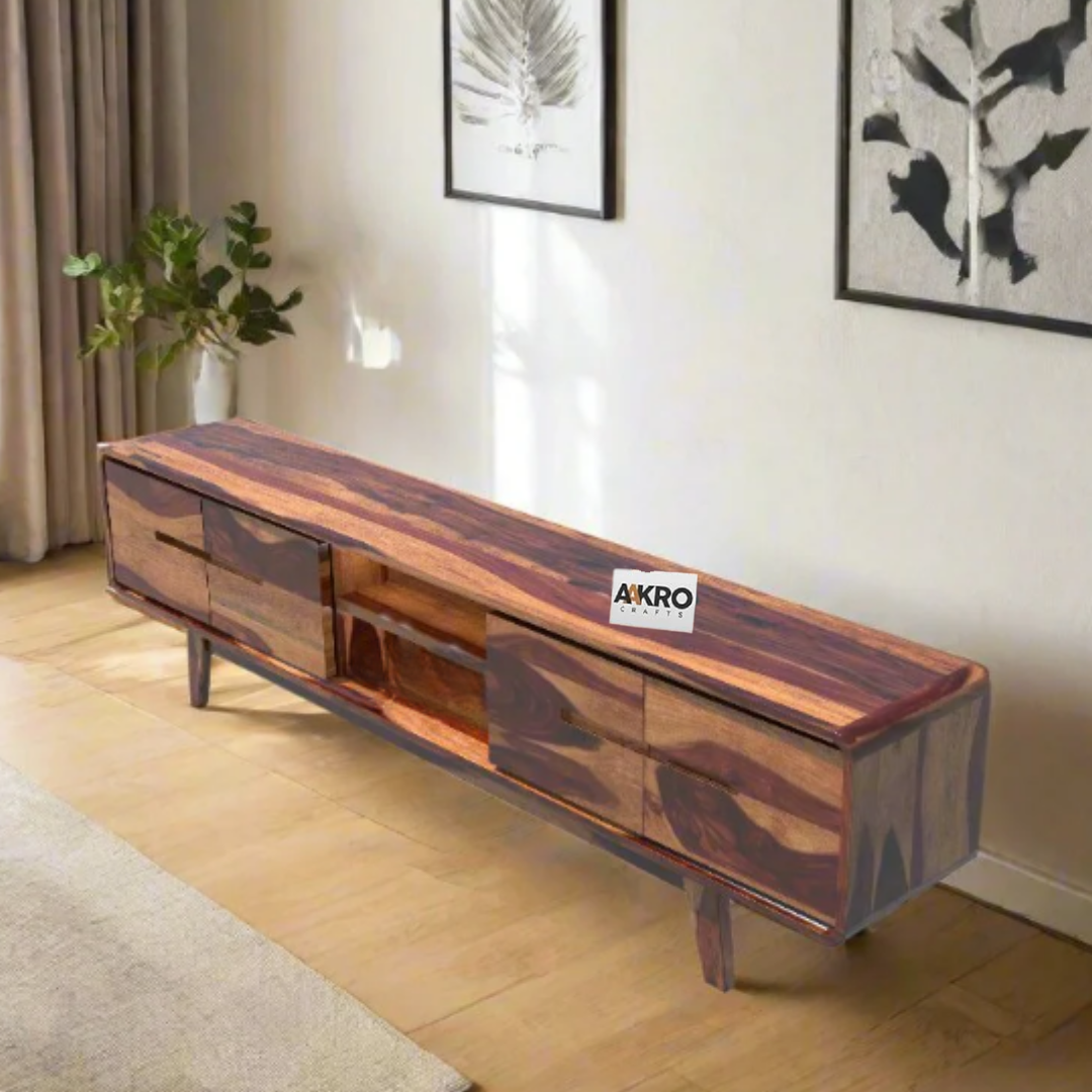 Upgrade your living room with the Homlen Sheesham Wood Four Door Two Open Shelf TV Cabinet from Aakrocrafts—a stylish and functional solution for your media storage needs.