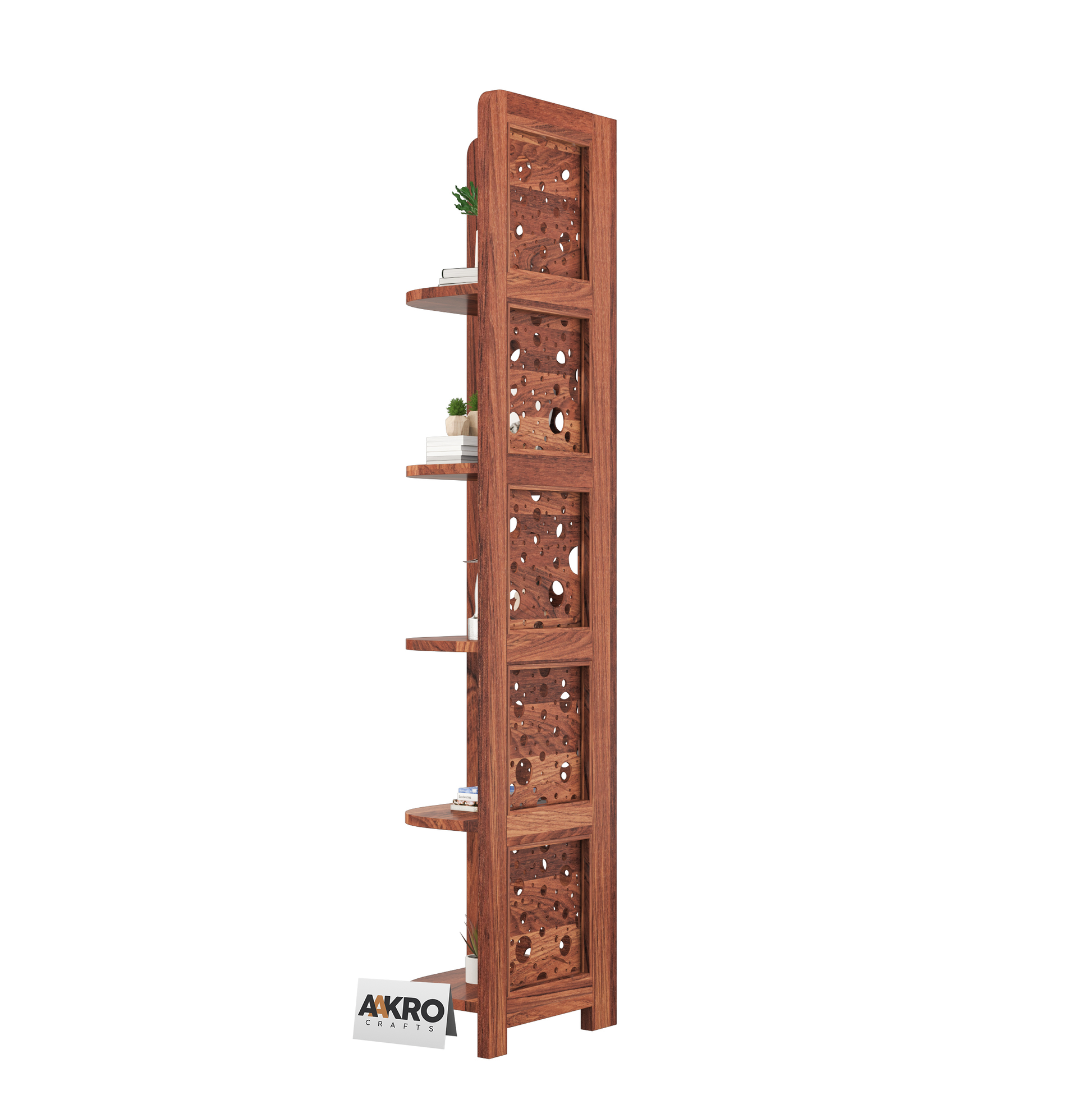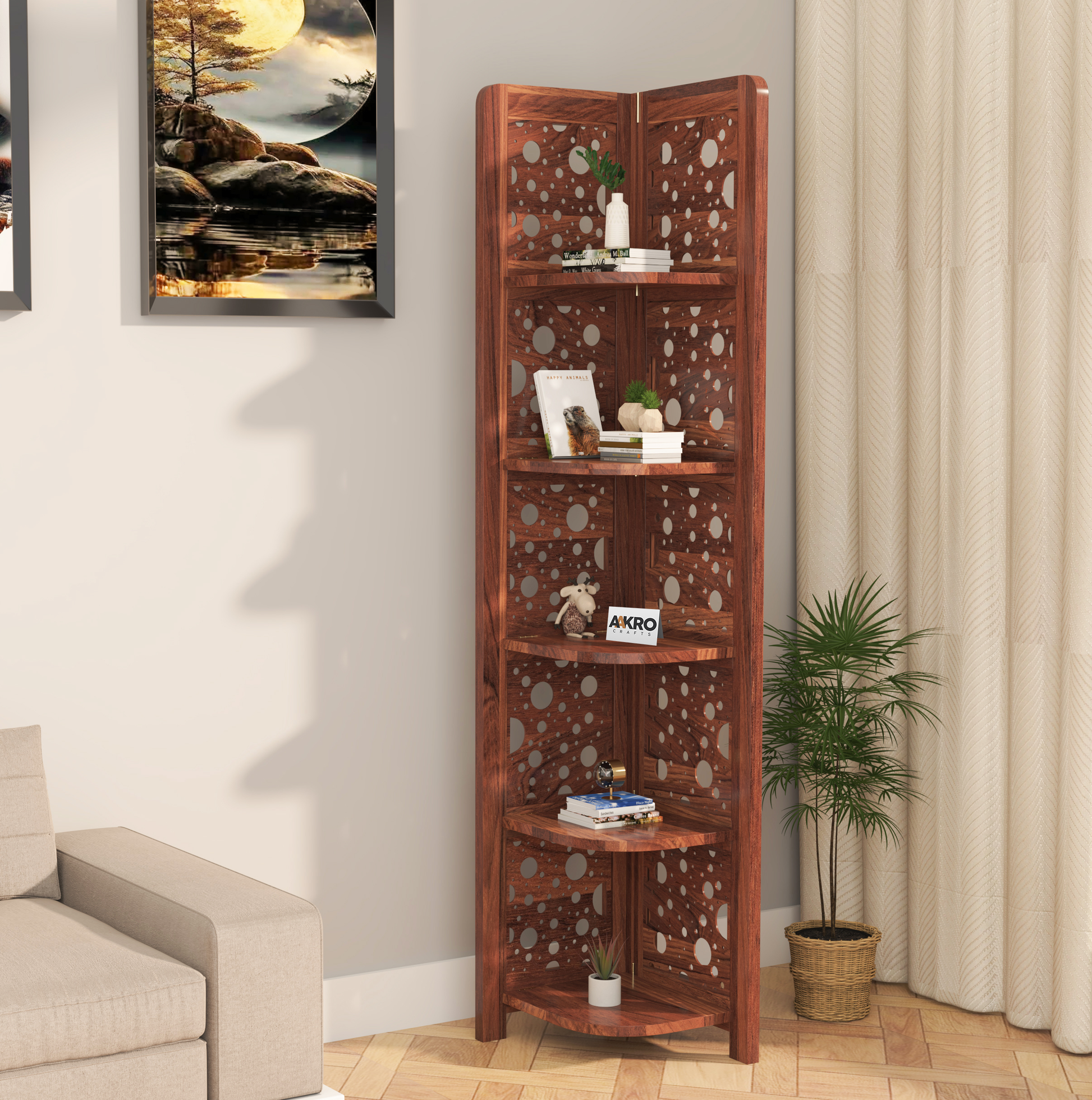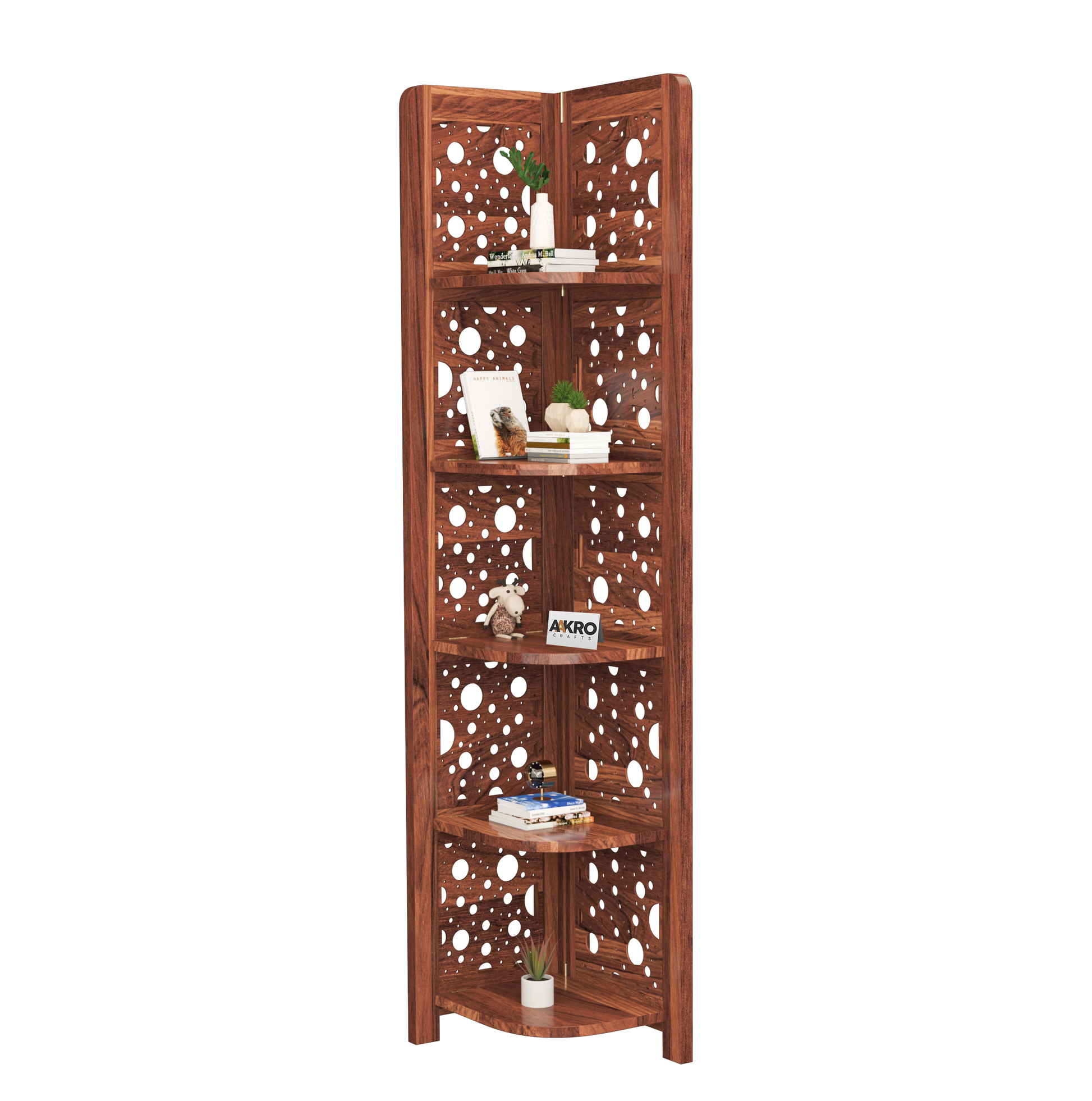 AAKROCRAFTS Solid Sheesham Wood Corner Shelf. This 5-tier ladder shelf is designed to optimize storage while adding a touch of elegance to any room. The honey finish brings warmth to your home decor, making it a perfect addition to modern and traditional interiors alike. Made from premium Sheesham wood, this bookshelf offers durability and a natural look. Its corner design maximizes space usage, ideal for smaller rooms or to showcase your favorite books, collectibles, and decor pieces in style. With a stable structure and a versatile aesthetic, this wooden rack is a statement piece that blends functionality and beauty effortlessly.