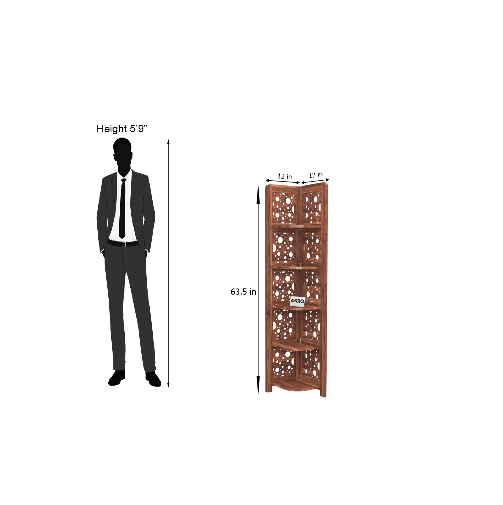 Levi Sheesham Wood Cricle Corner Shelf for Living Room Bedroom Home | CNC 5 Tier Corner Bookshelf | Wooden Ladder Bookcase Display Unit (Honey Finish)
