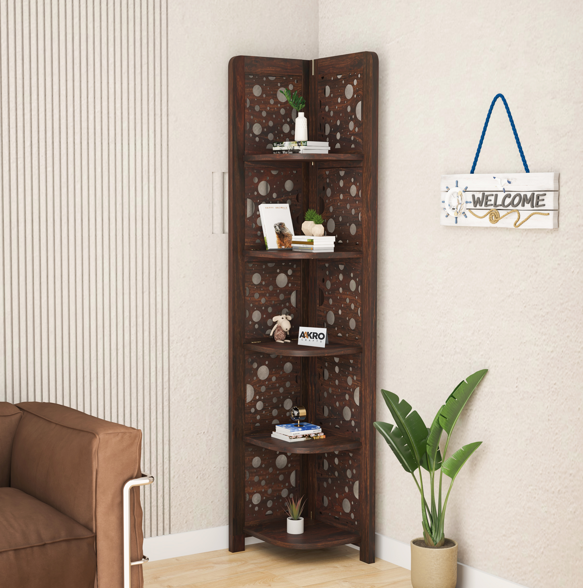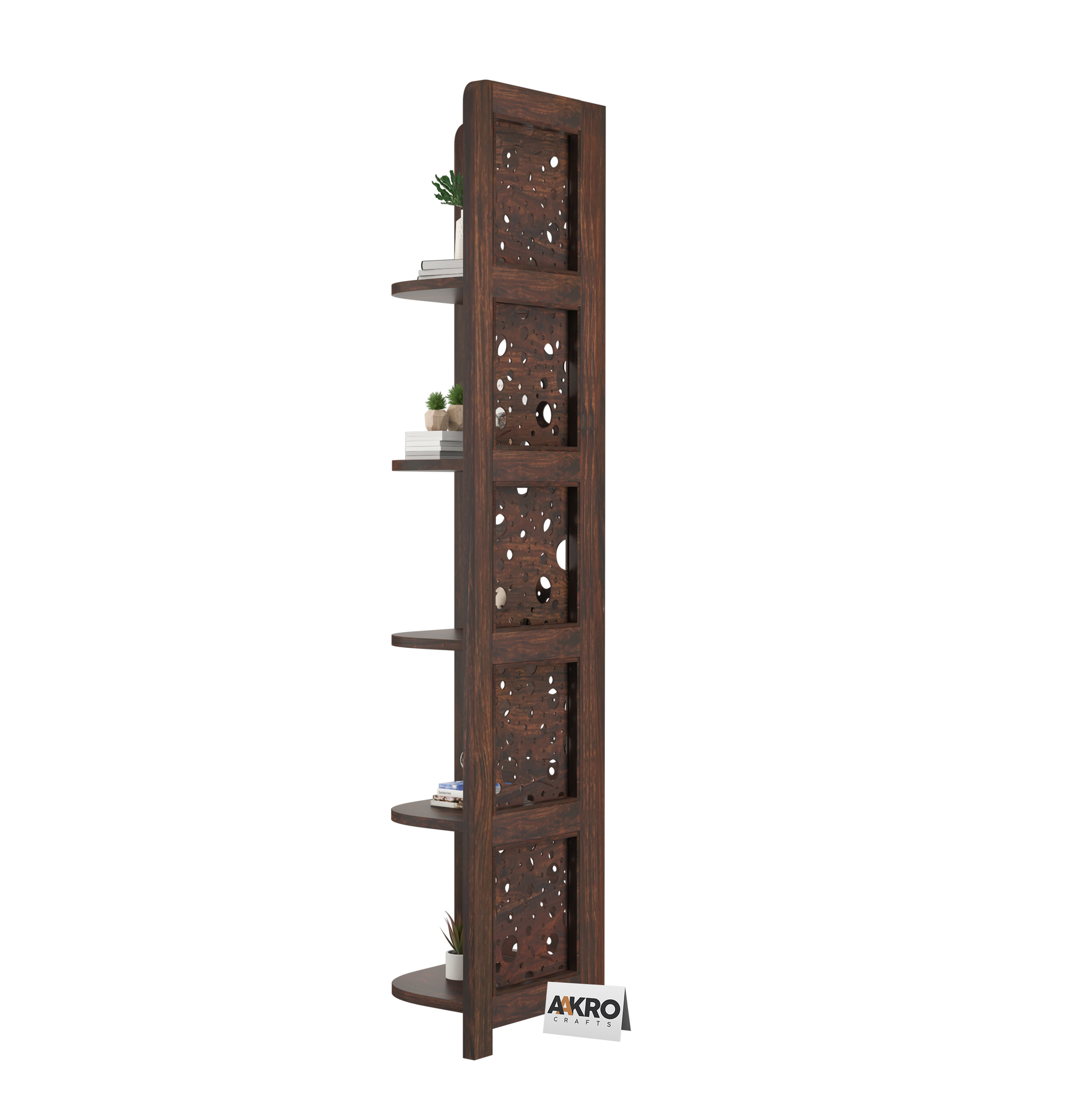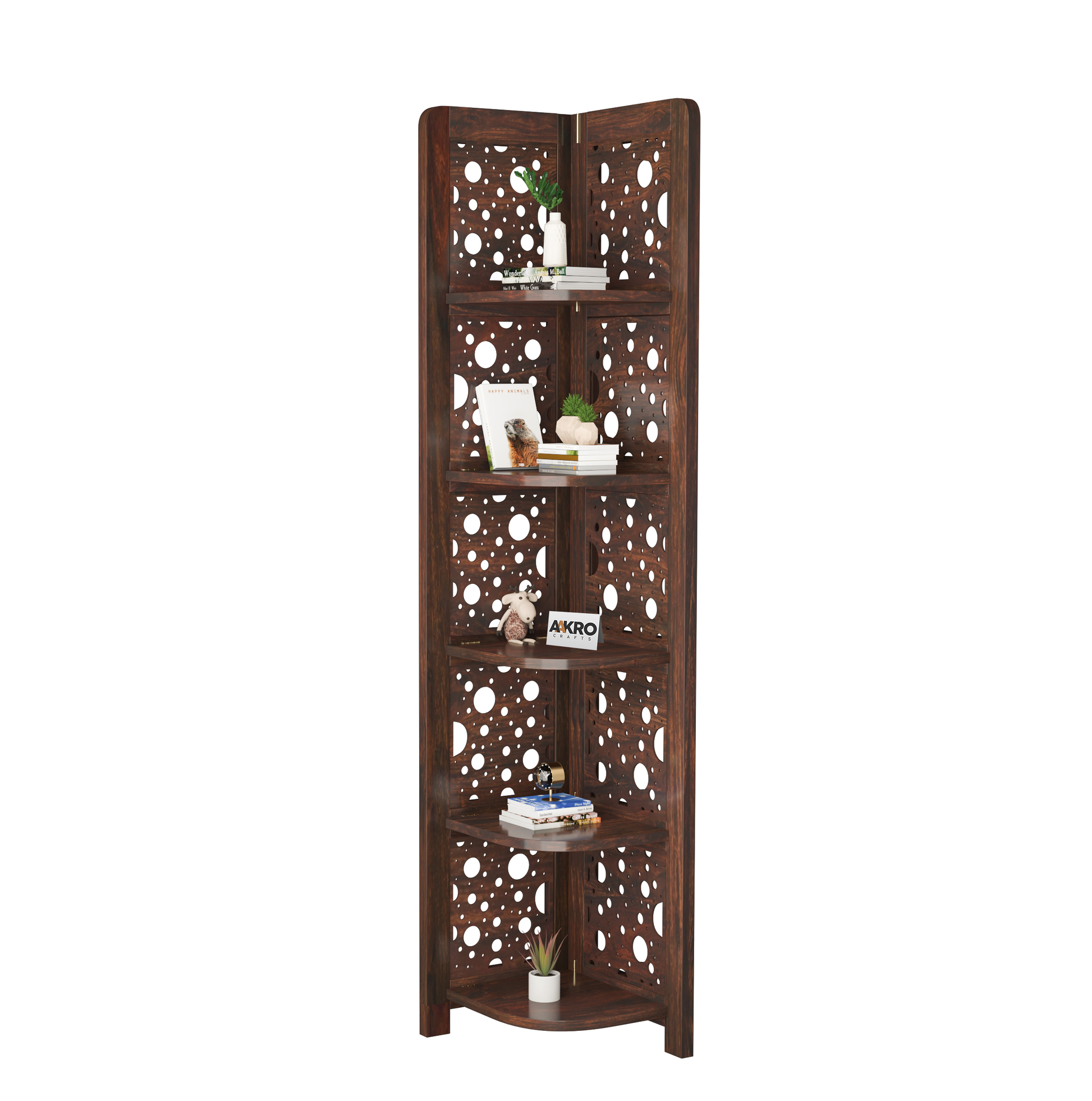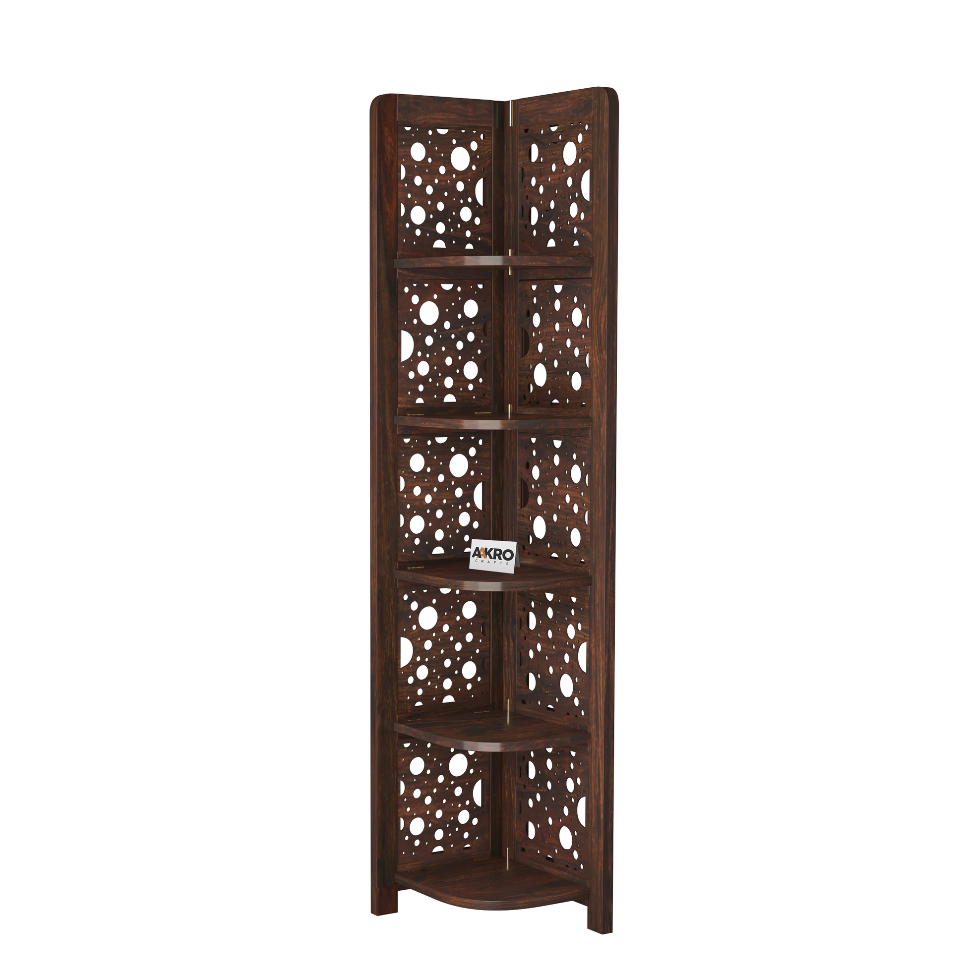 Levi Sheesham Wood Cricle Corner Shelf for Living Room Bedroom Home | CNC 5 Tier Corner Bookshelf | Wooden Ladder Bookcase Display Unit (Walnut Finish)
