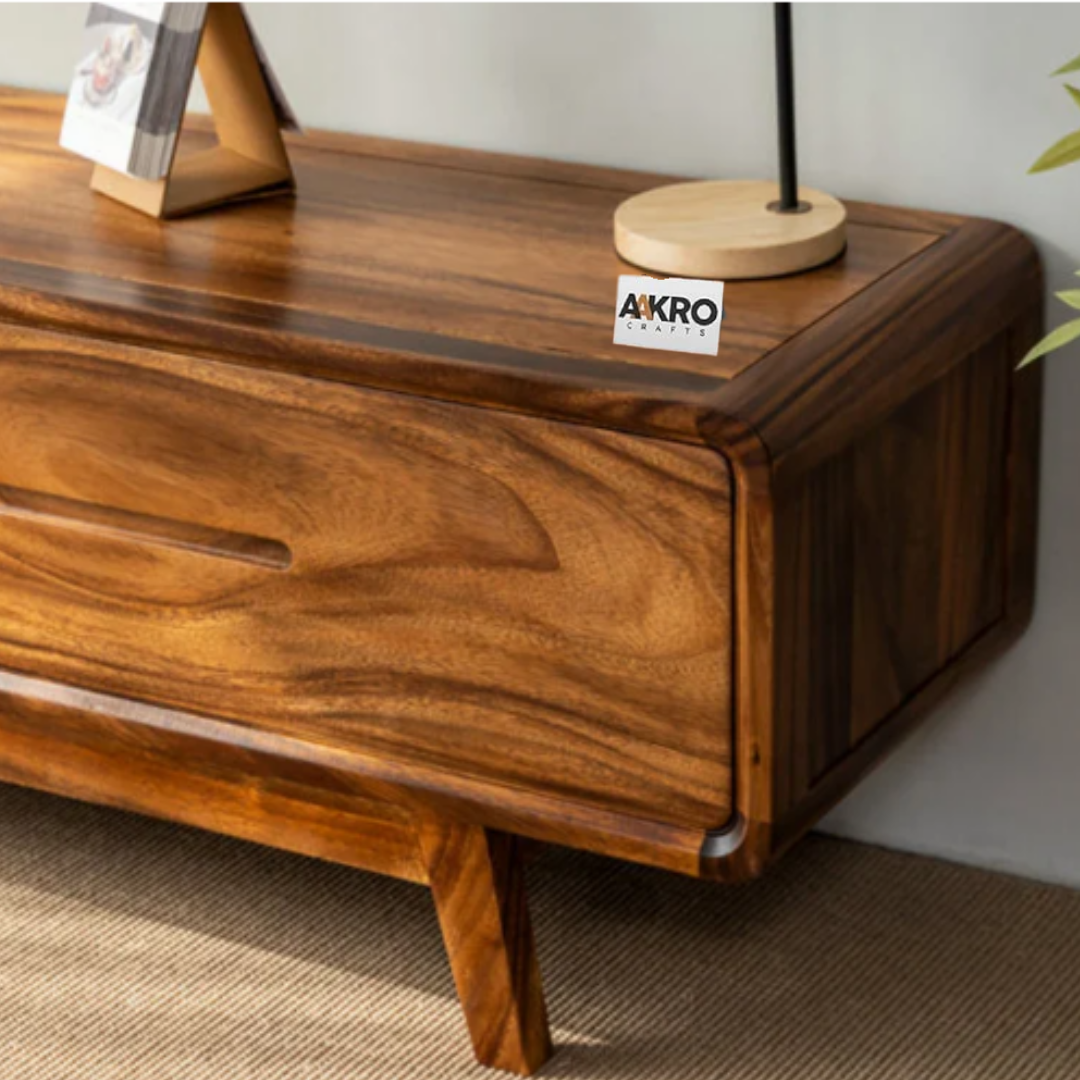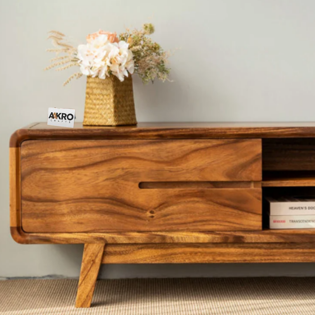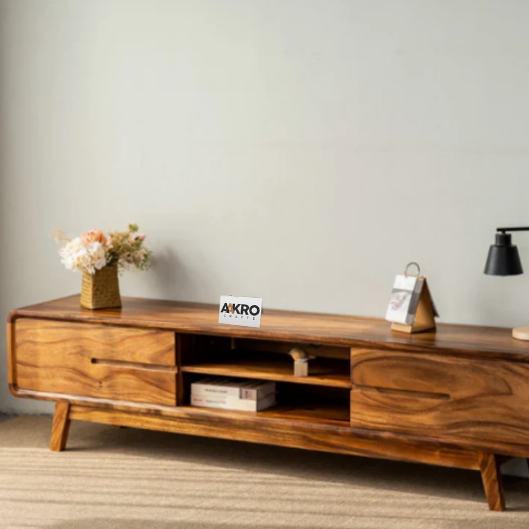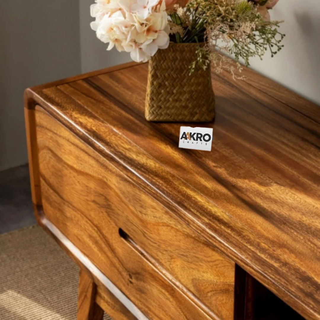Introduce natural elegance and practical organization to your entertainment area with the Loadly Sheesham Wood TV Cabinet by Aakrocrafts. Expertly crafted from durable Sheesham wood, this TV cabinet beautifully combines warm grain texture with versatile functionality.