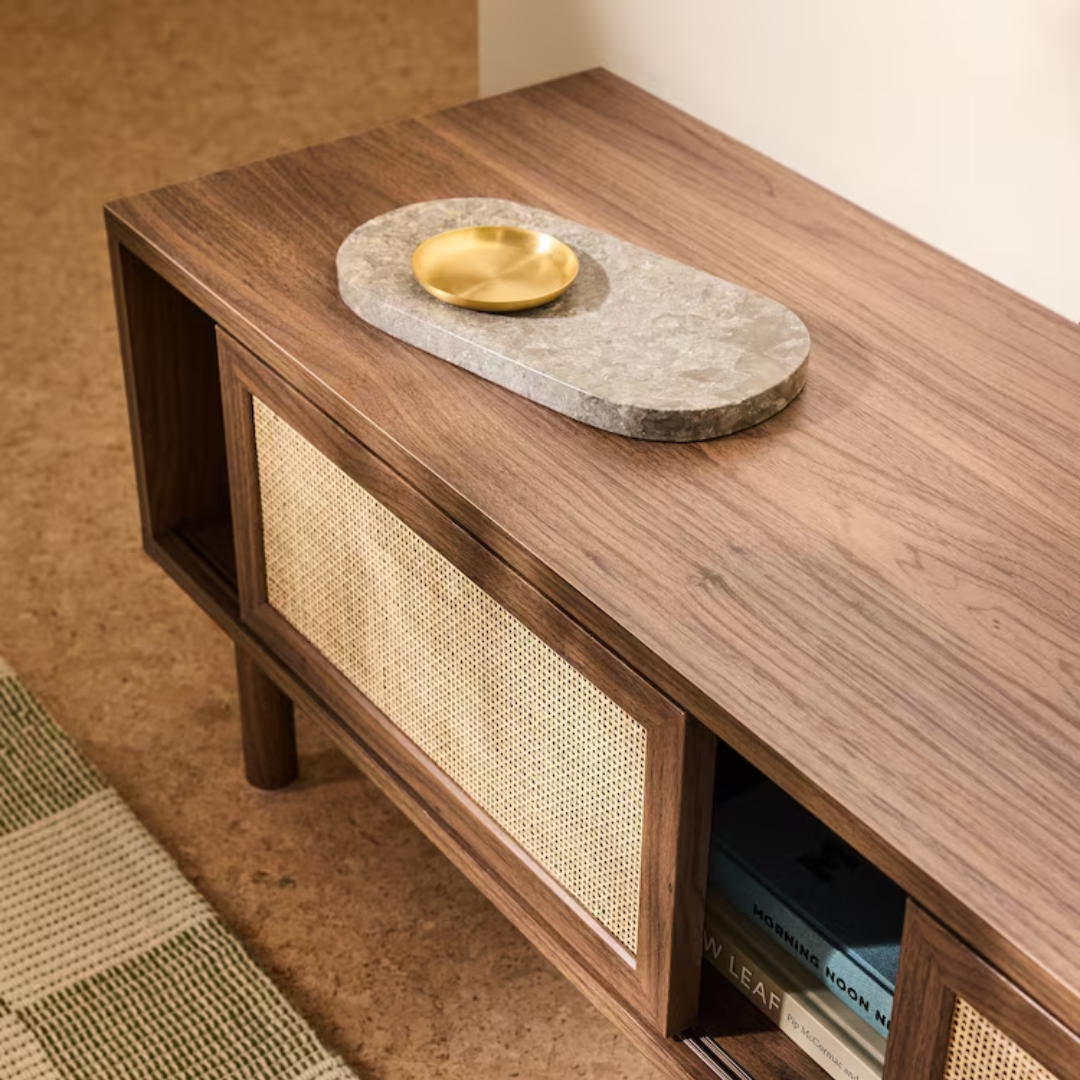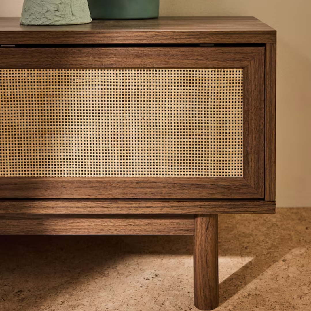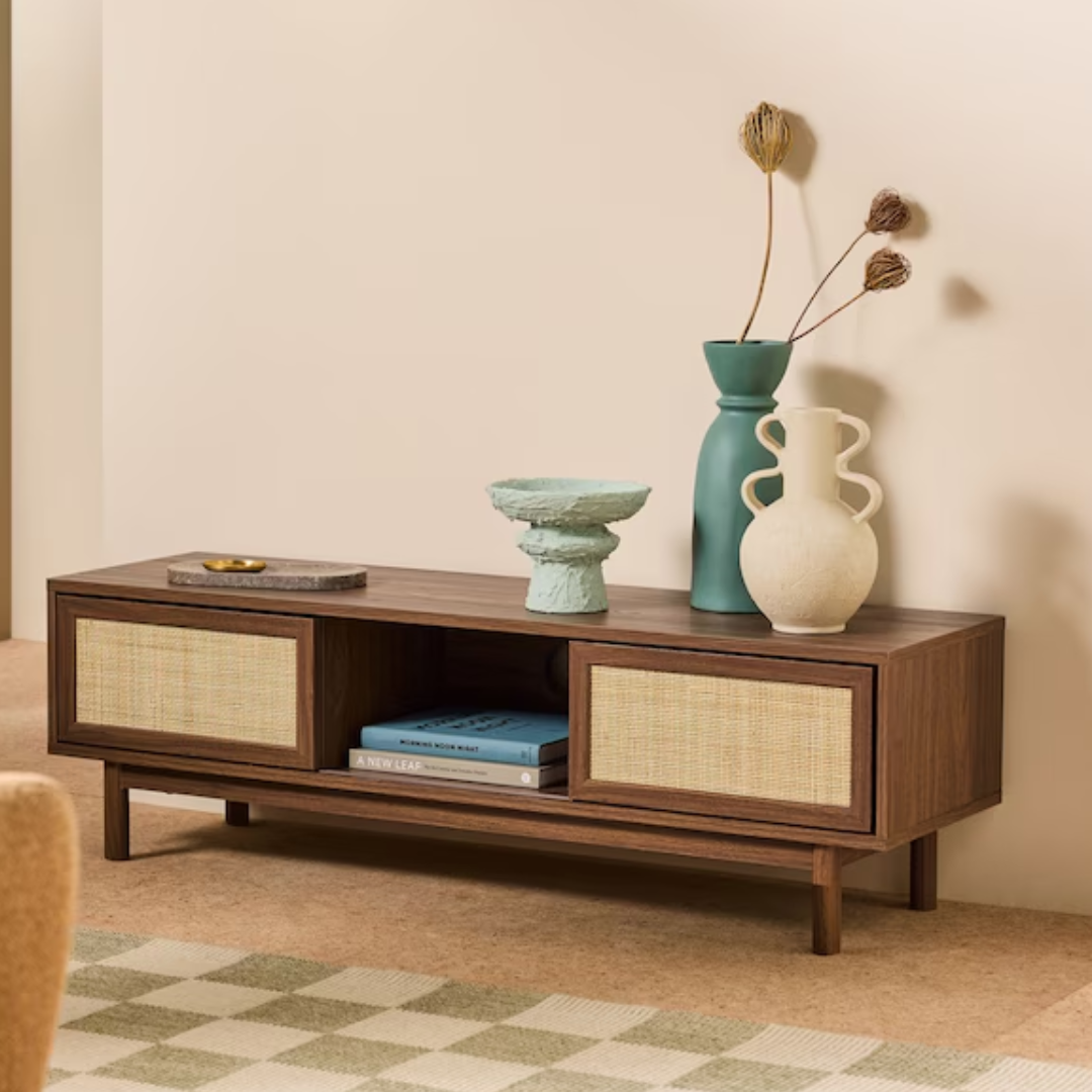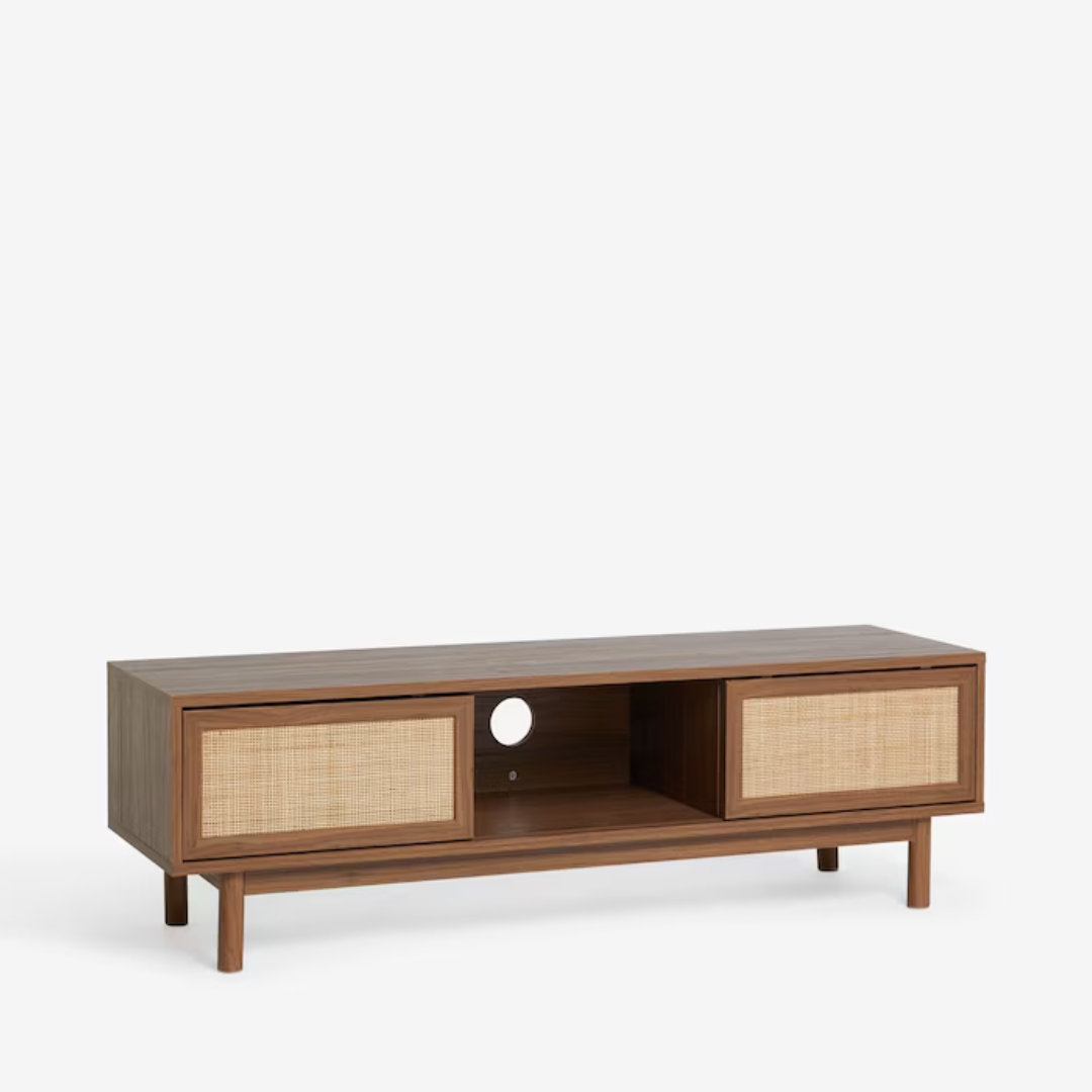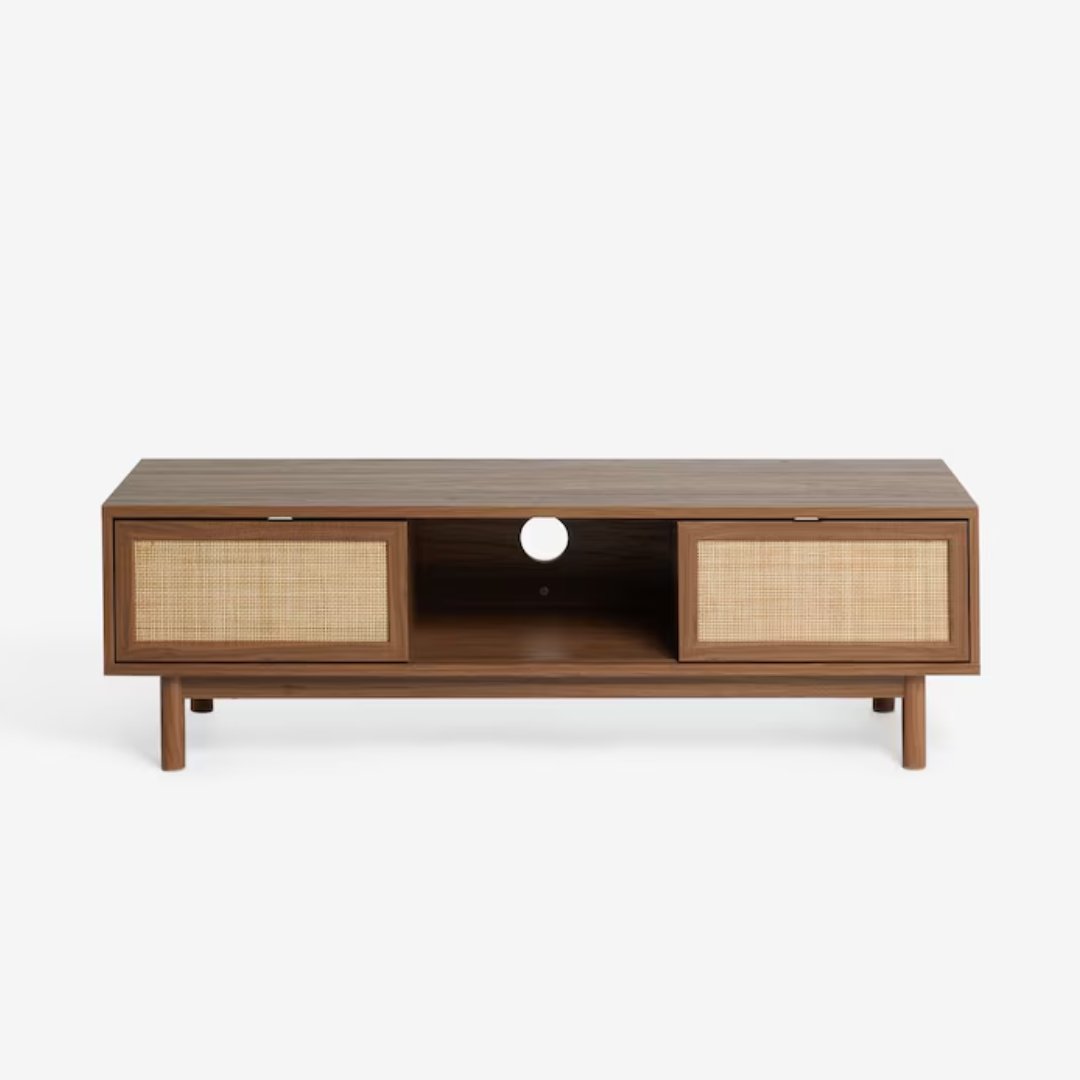 Natural materials: Crafted with rattan accents and a robust wood frame, the Novinest adds inviting texture while ensuring durable support for your media devices.