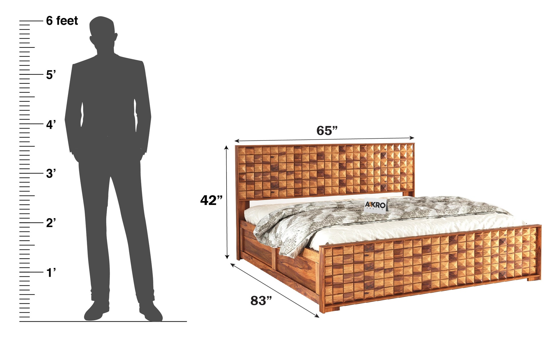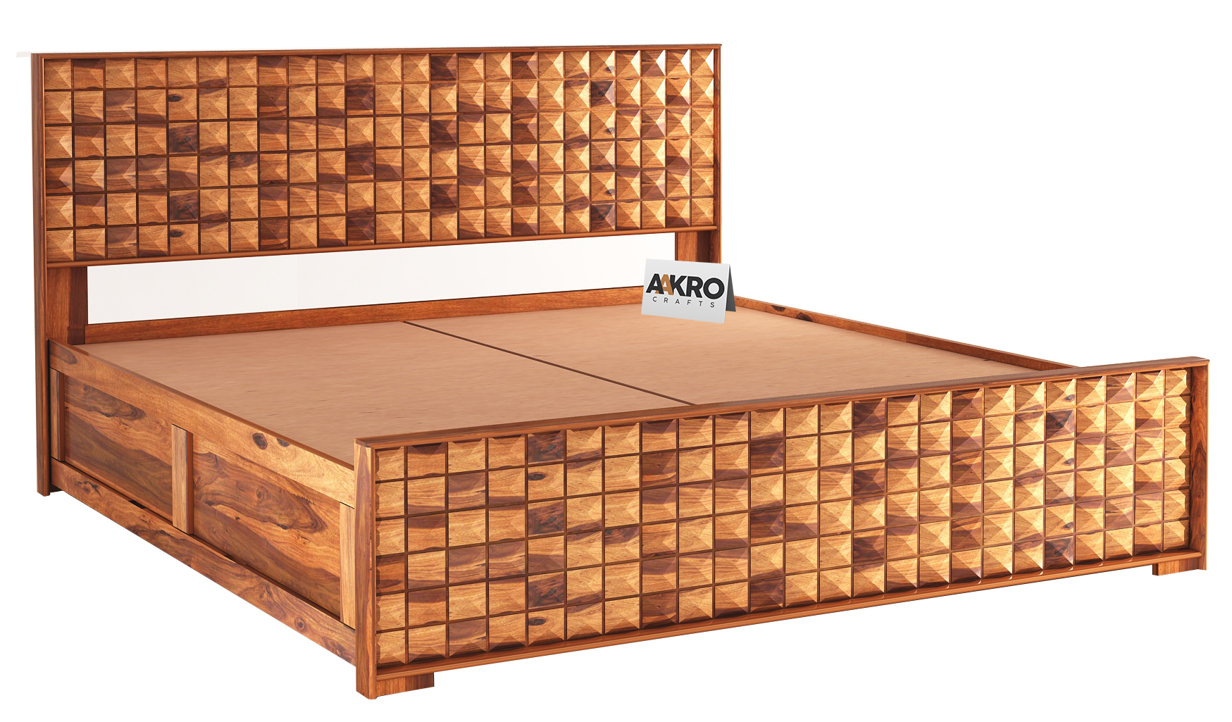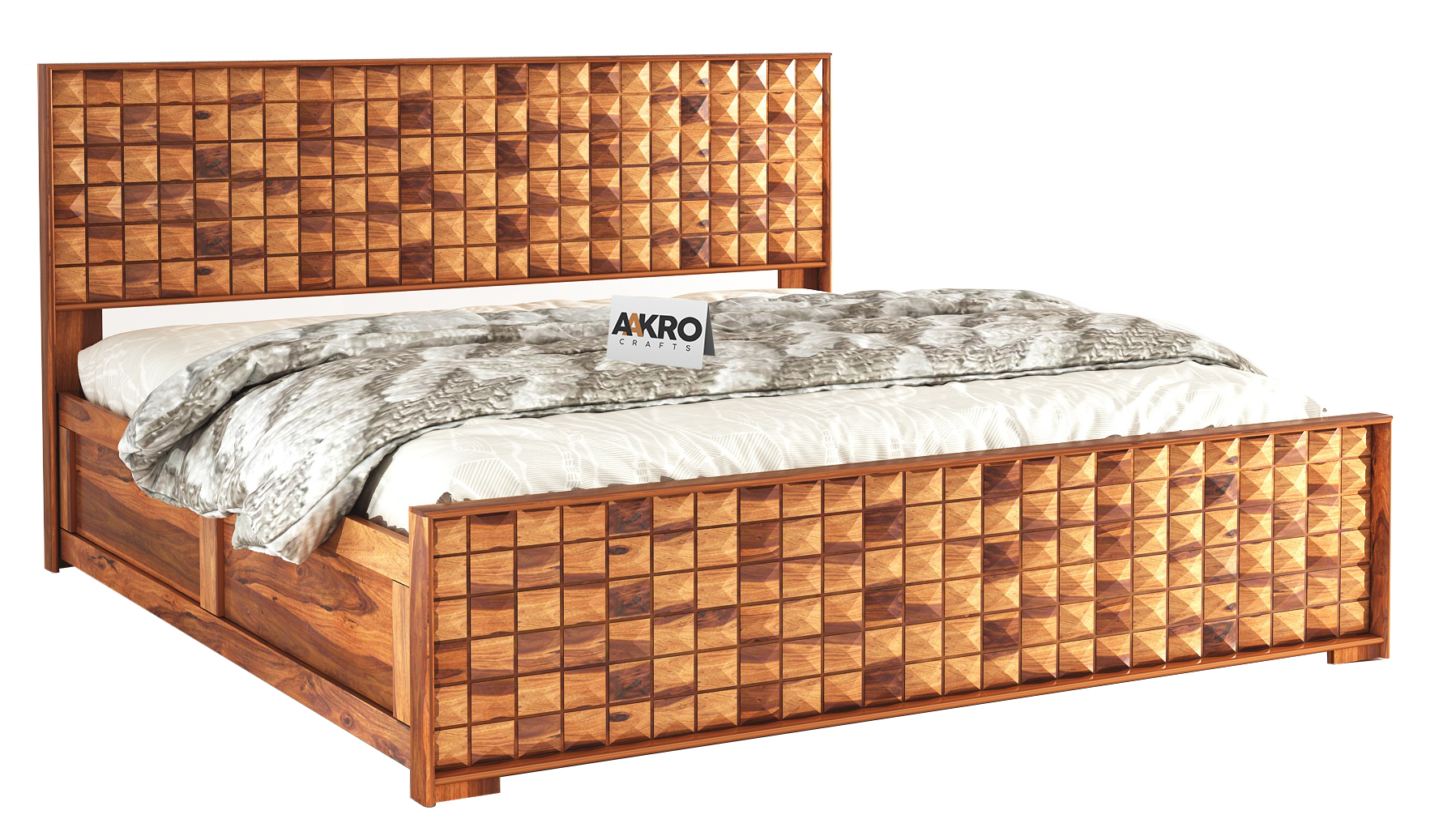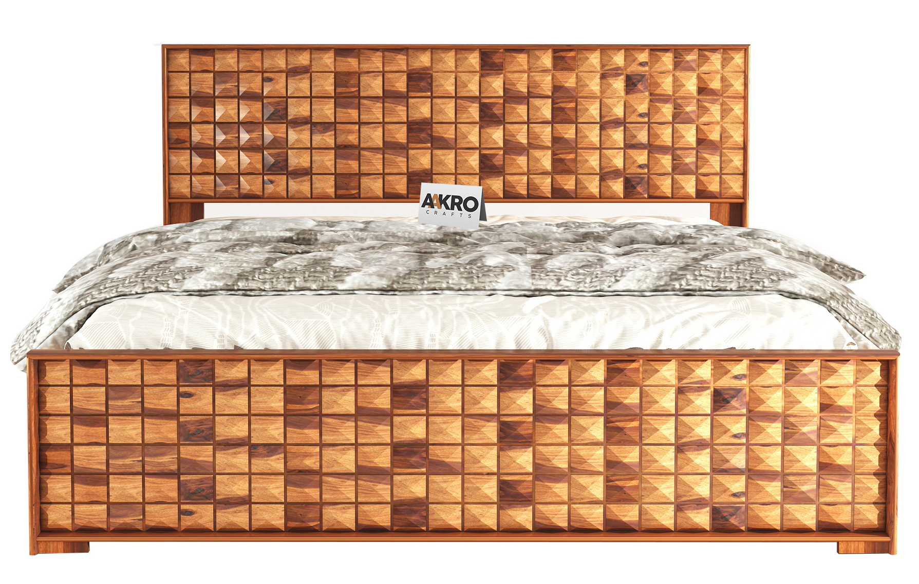 Aakrocrafts Double Bed, crafted from solid Sheesham wood, will instantly enhance your bedroom with its sophisticated and elegant design. This bed is a perfect blend of style and functionality, designed to complement a variety of home decors. Its classic yet modern look adds a touch of luxury and warmth to any space, making it a timeless piece that fits seamlessly with both contemporary and traditional interiors. This solid wood bed features a spacious box storage design, providing ample room to neatly store your valuables, bedding, and other essentials, helping you keep your bedroom organized and clutter-free. The double frame of this box storage bed ensures comfort and support for a restful night's sleep. It’s also referred to as a palang, double bed, char pai, or cot, making it a versatile addition to your home. Perfect for the bedroom or even the living room, the Aakrocrafts Double Bed is an attractive and functional piece that adds an inviting charm to any room.
