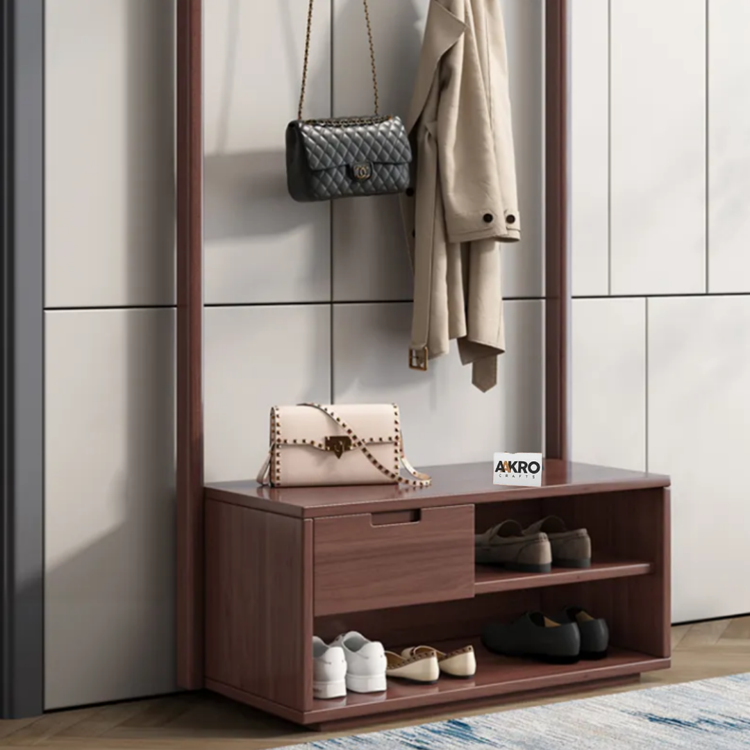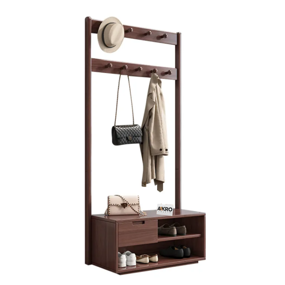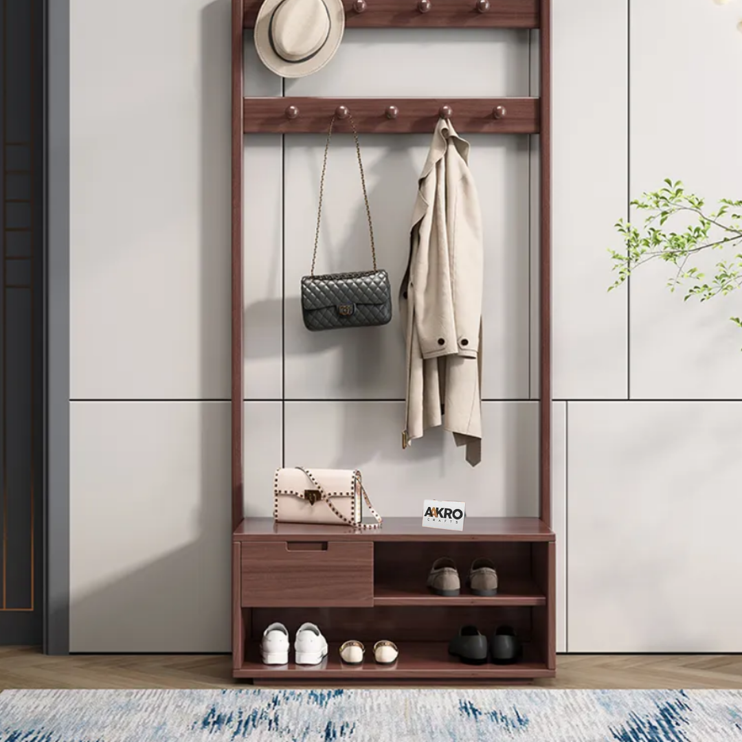 Enhance your entryway or living space with the Zenvia Coat Rack and Shoes Stand by Aakrocrafts—a thoughtfully crafted piece in premium solid wood, blending elegant utility with timeless design.