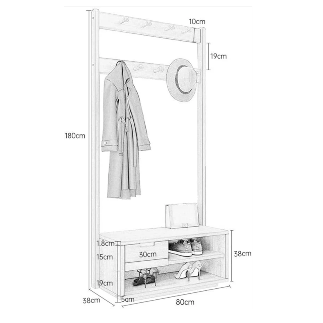Spacious shoe stand: The integrated lower shelves accommodate shoes and boots, ensuring a tidy, clutter-free environment. The width and depth support storage while maintaining a slim footprint for compact spaces.